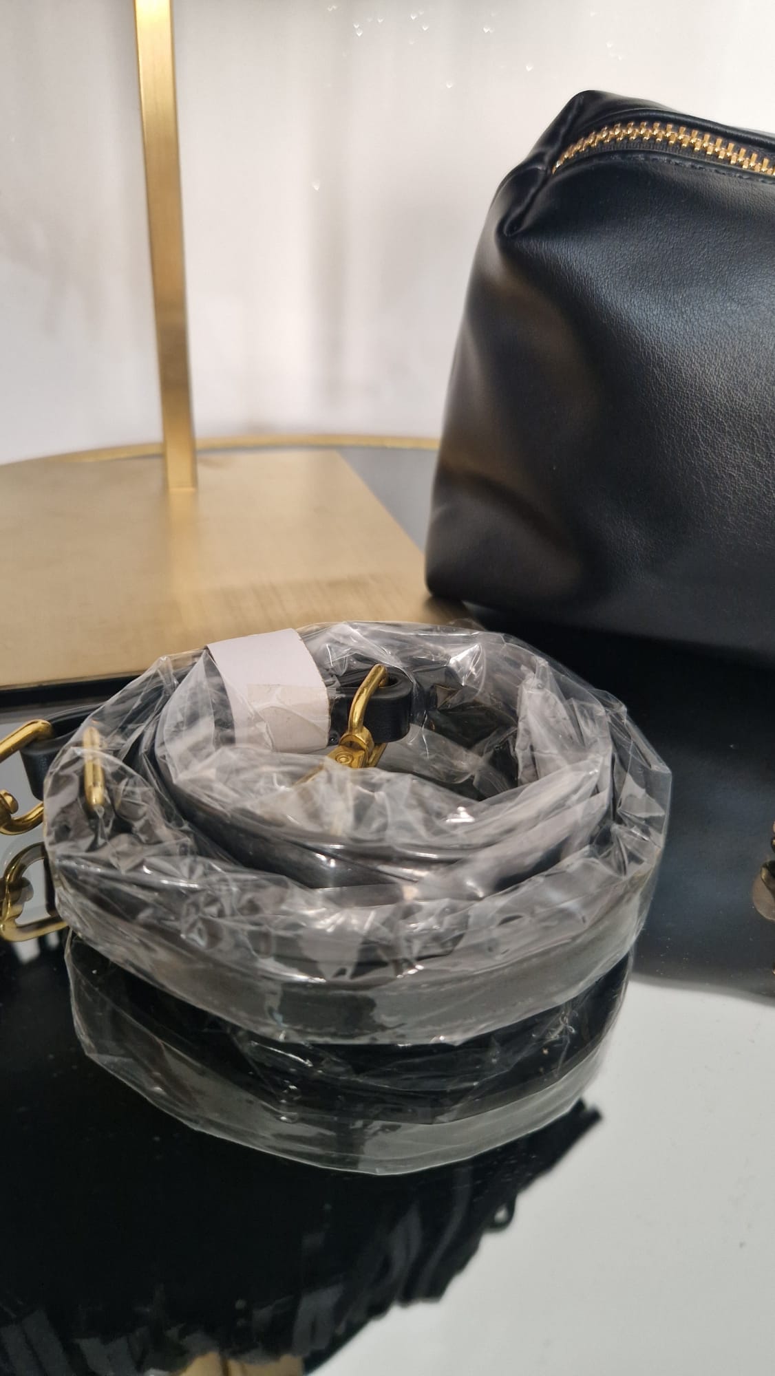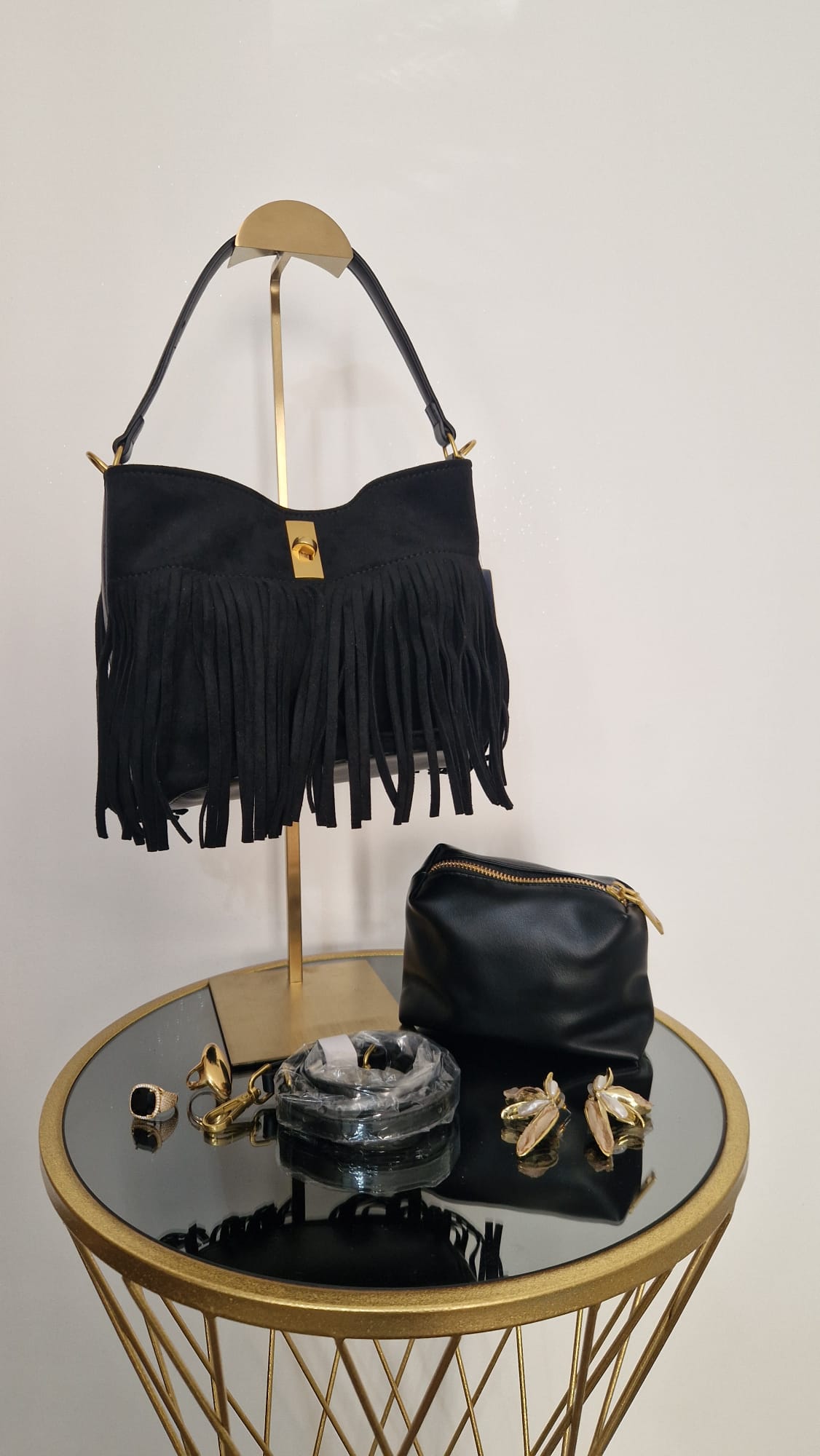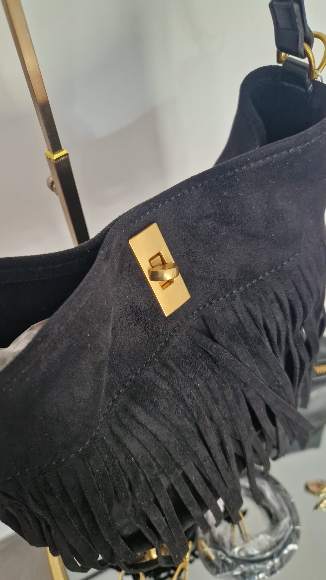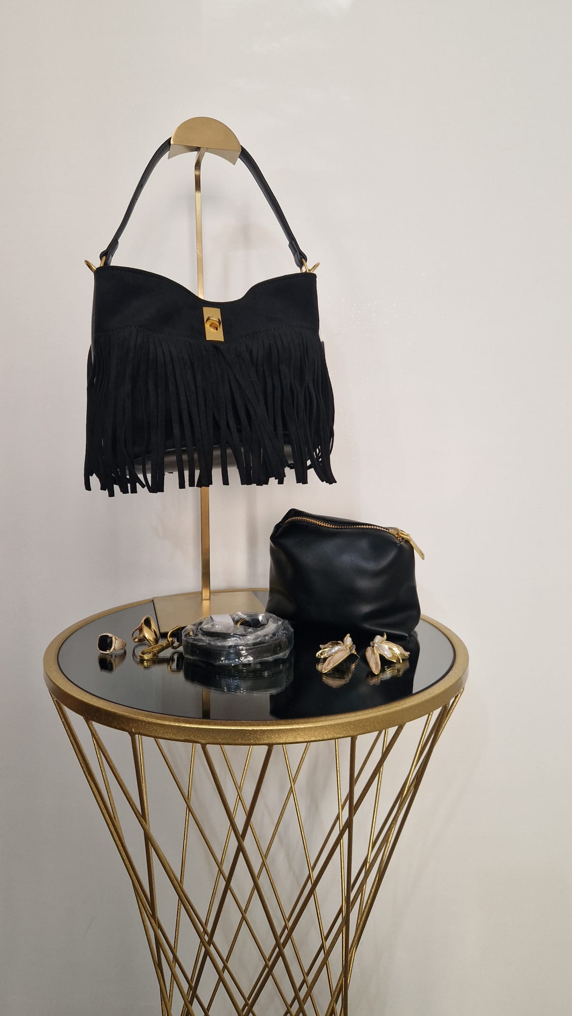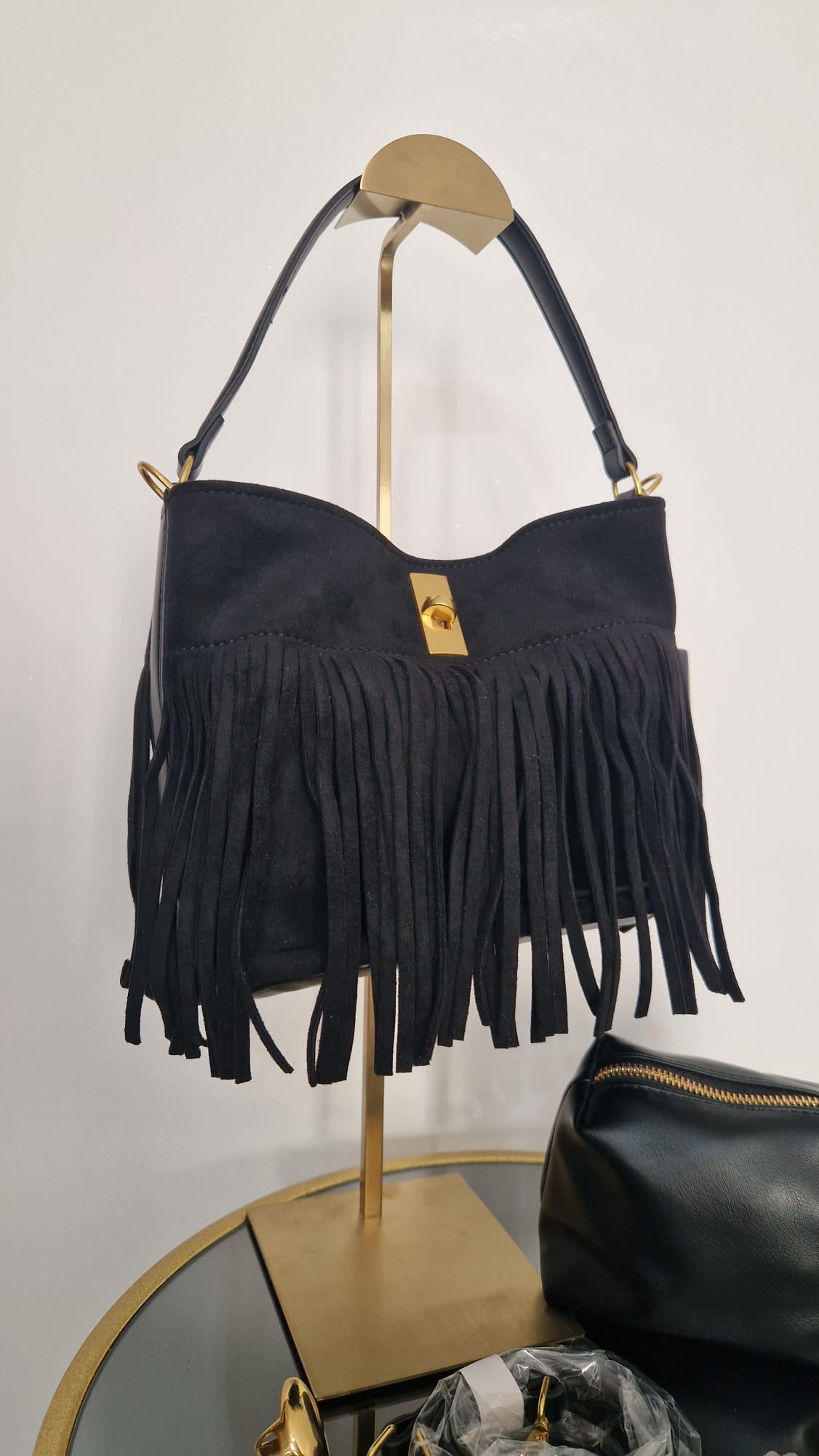 Borsa in camoscio con frange colore nero con pochette interno e tracolla regolabile .