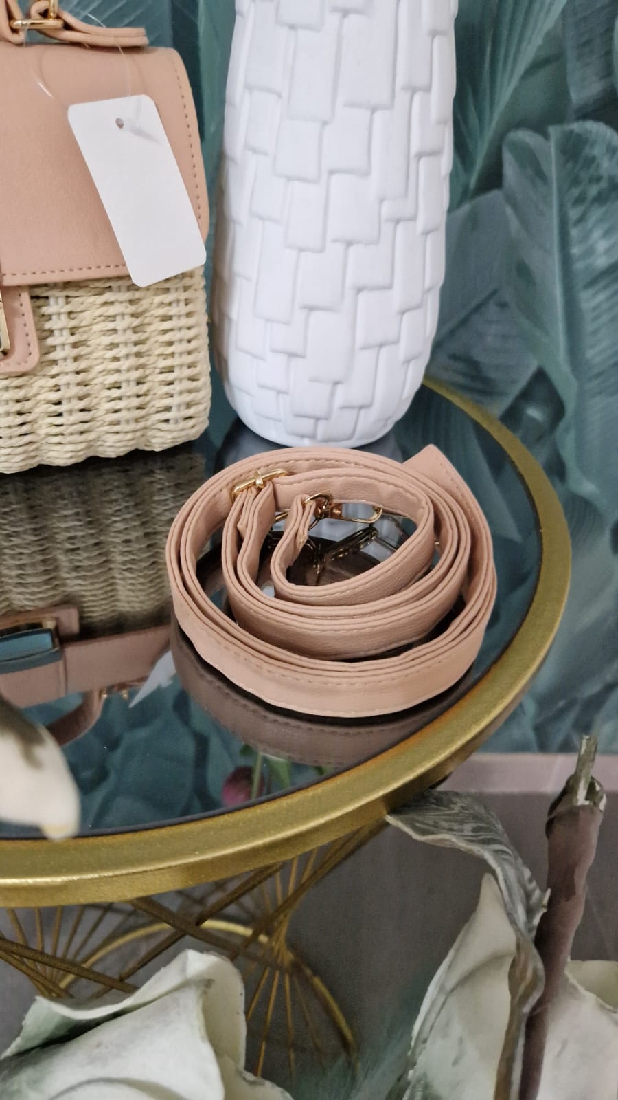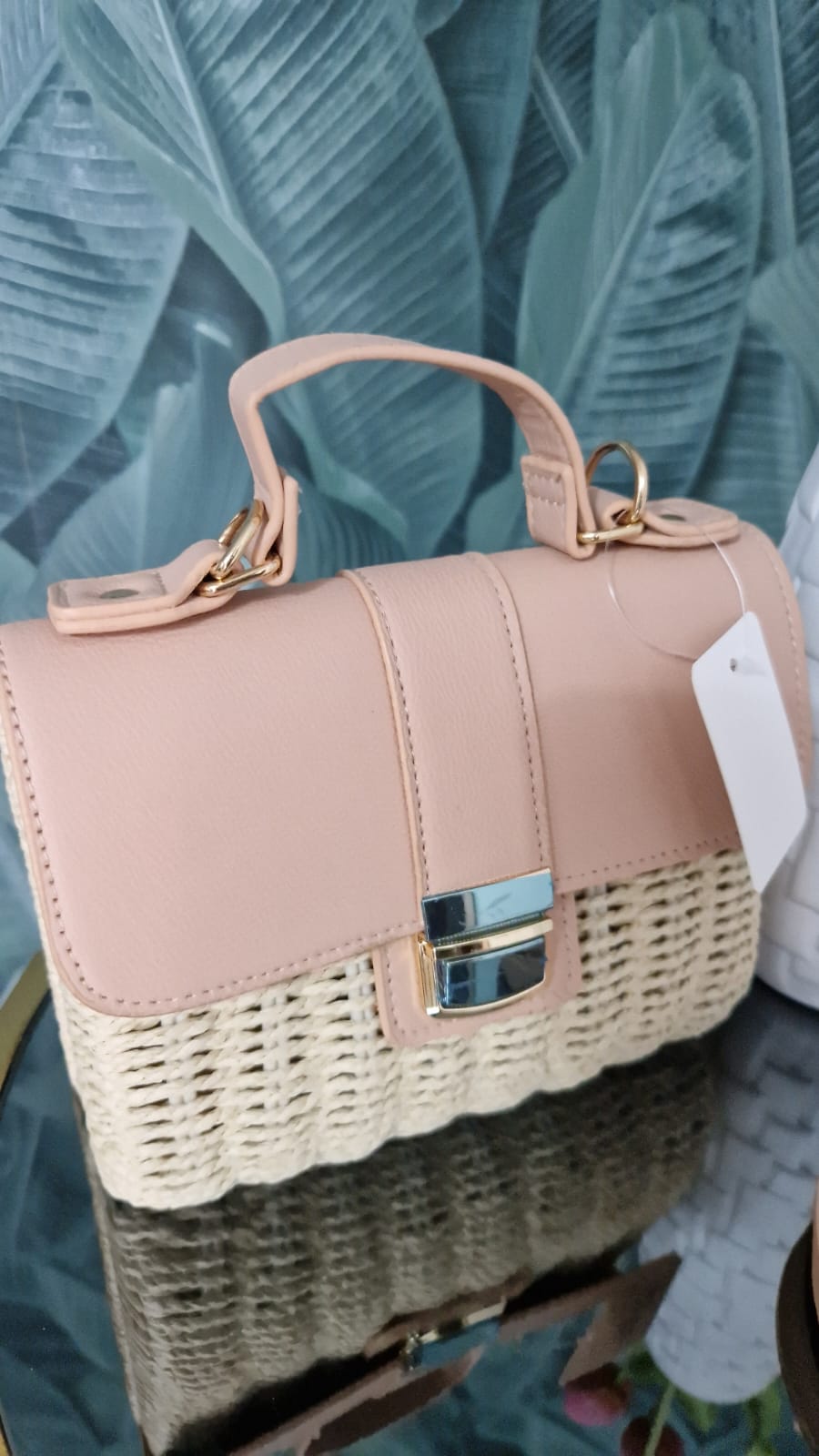 Borsa in Rafia colore beige e rosa con tracolla regolabile .