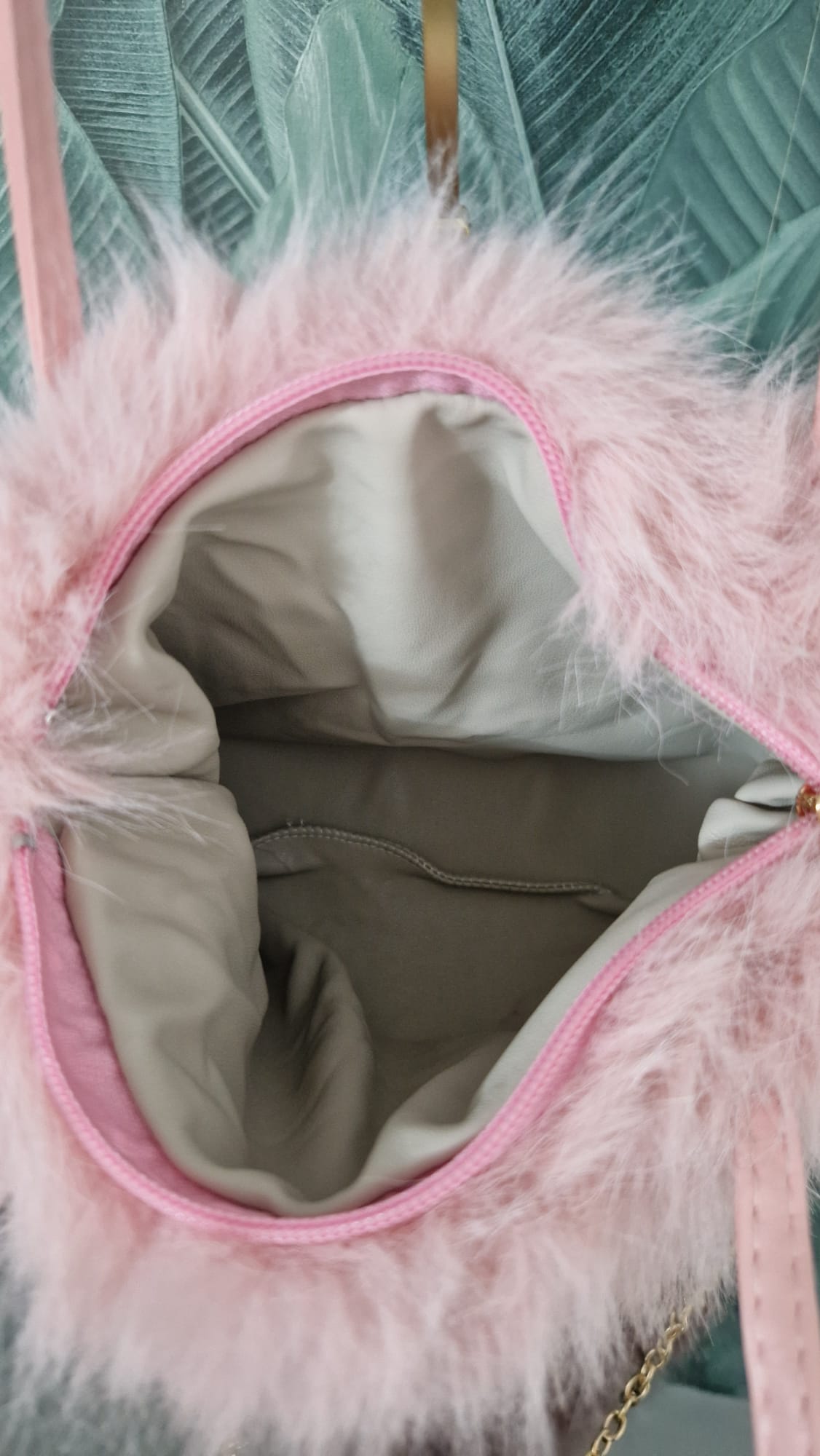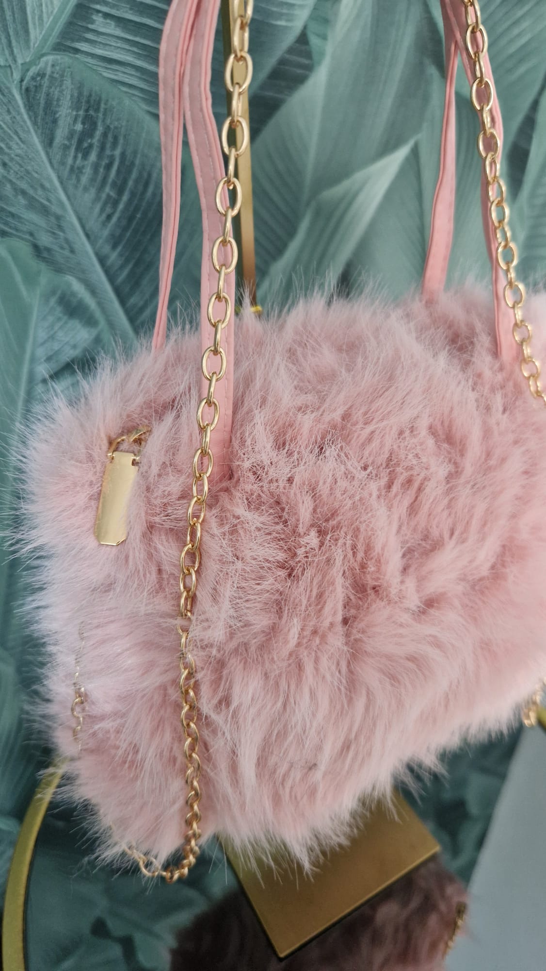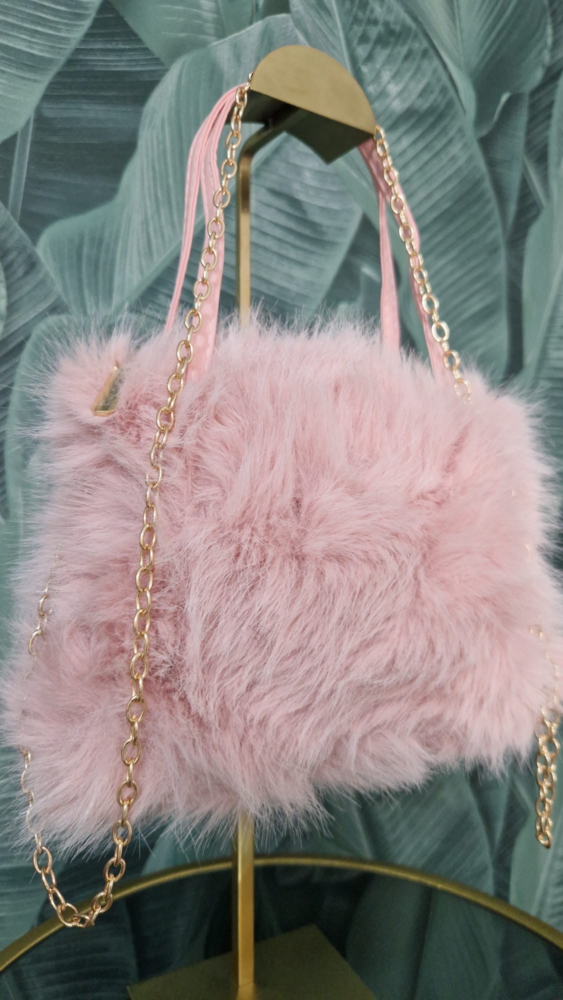 Borsetta Bon Bon in eco pelliccia colore rosa con catena in oro.