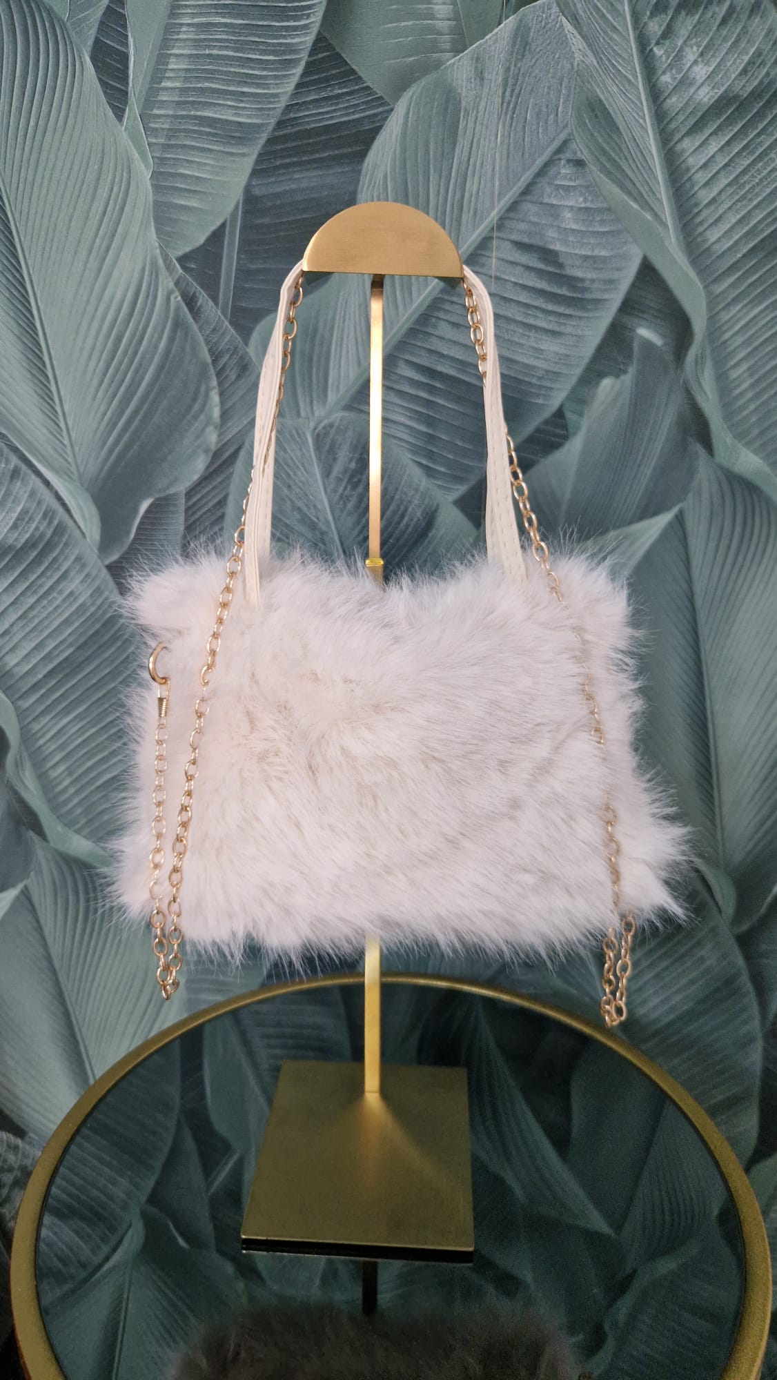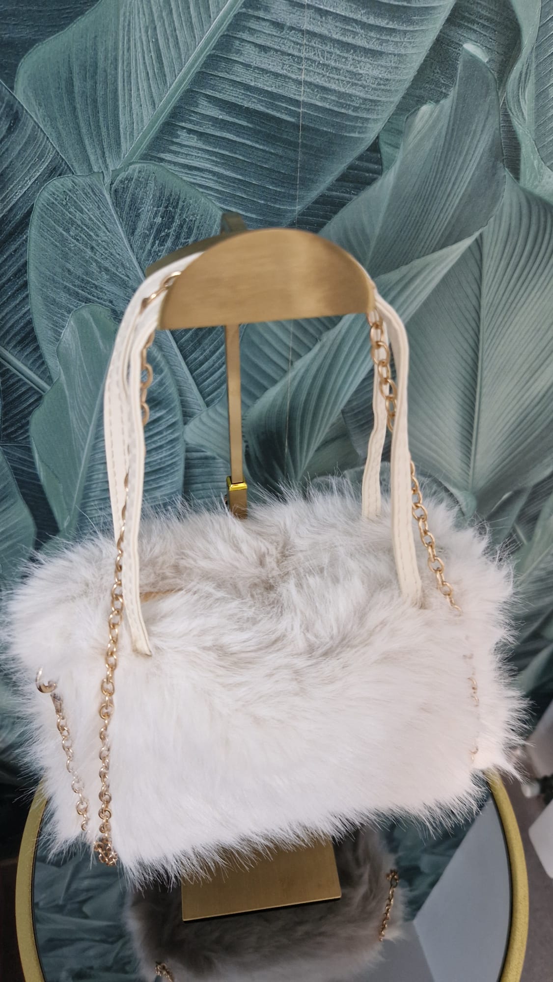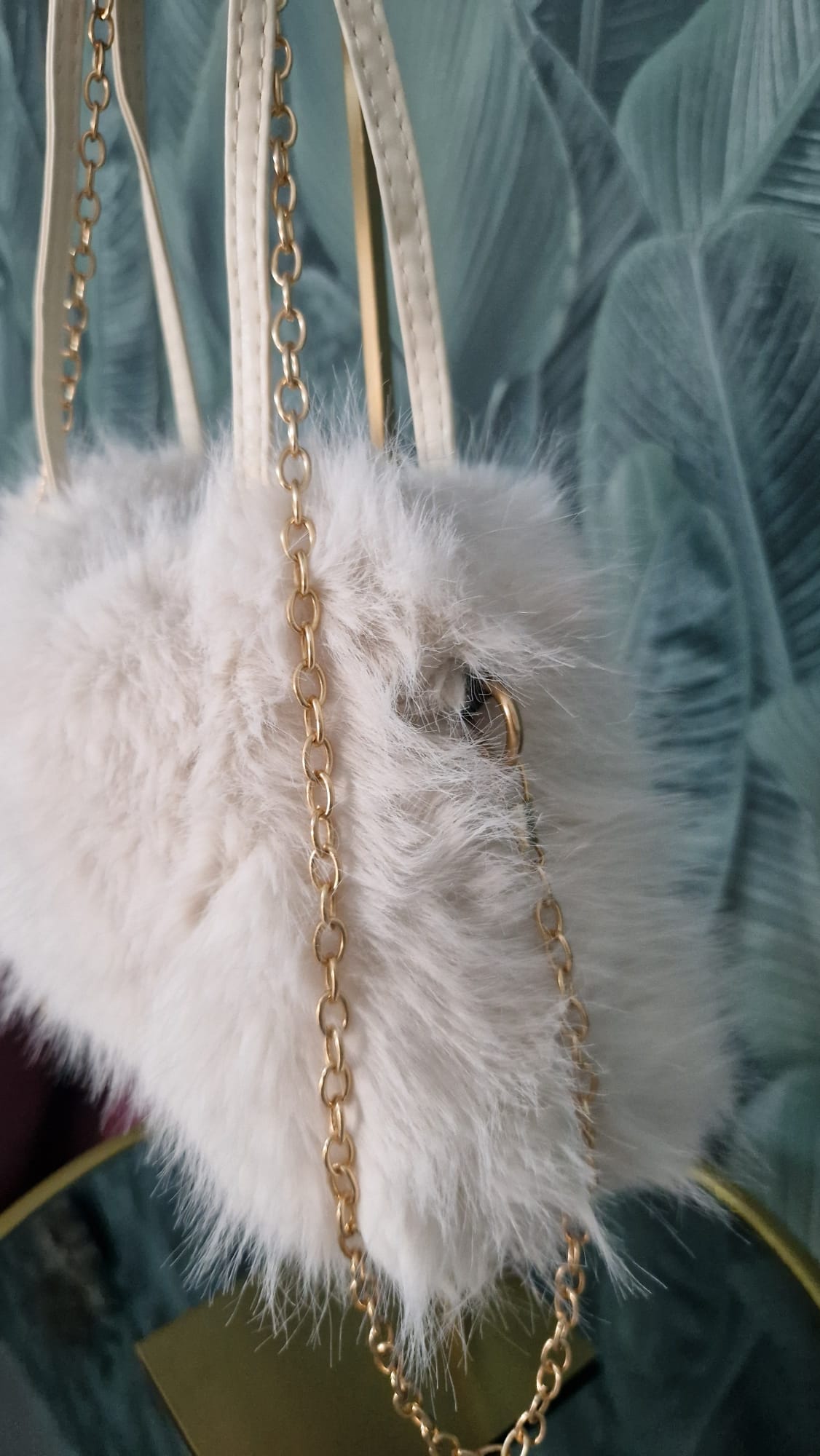 Borsetta Bon Bon in eco pelliccia colore bianco con catena oro .