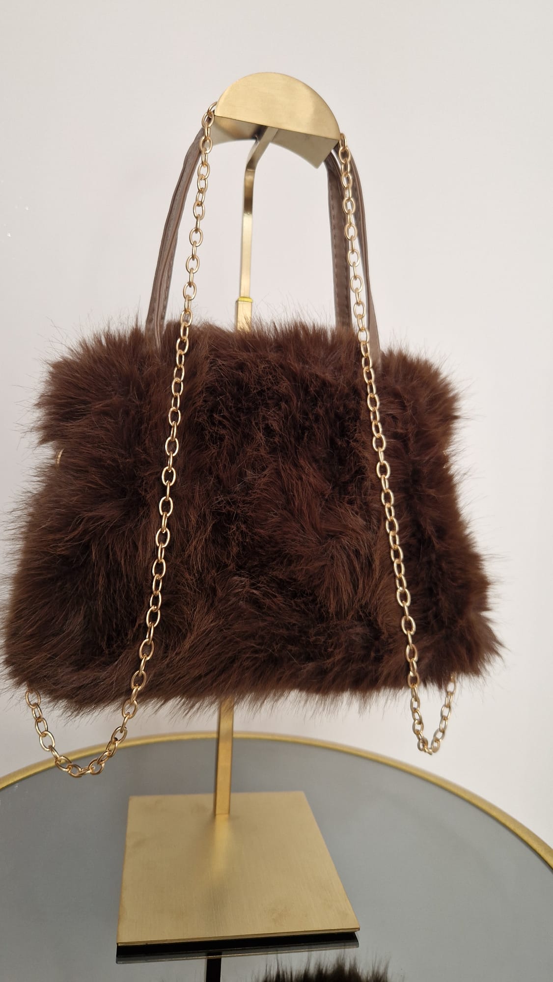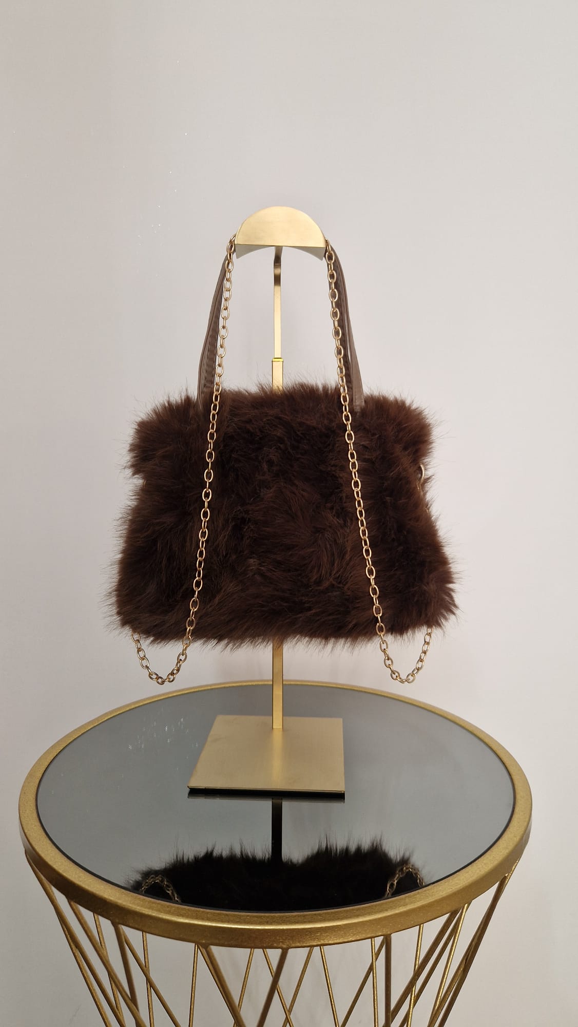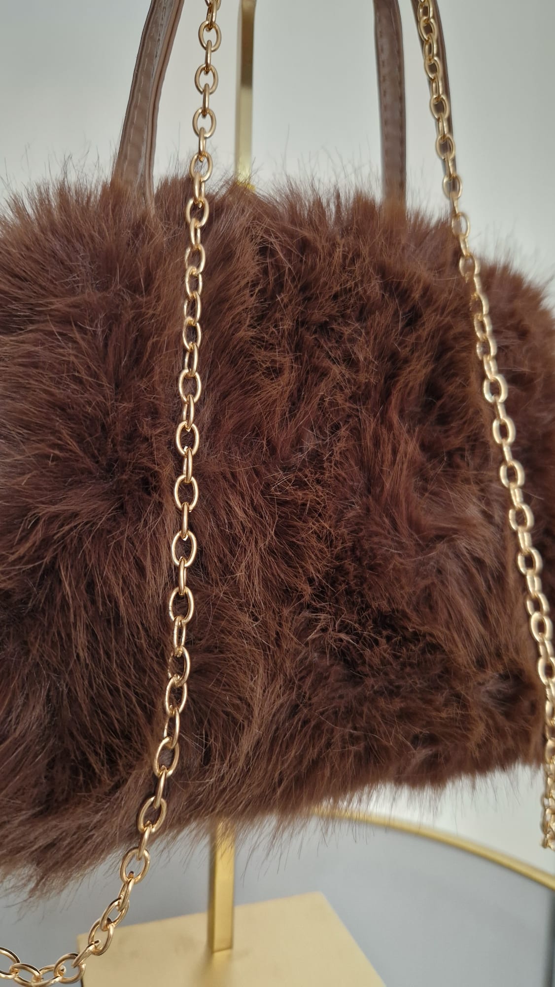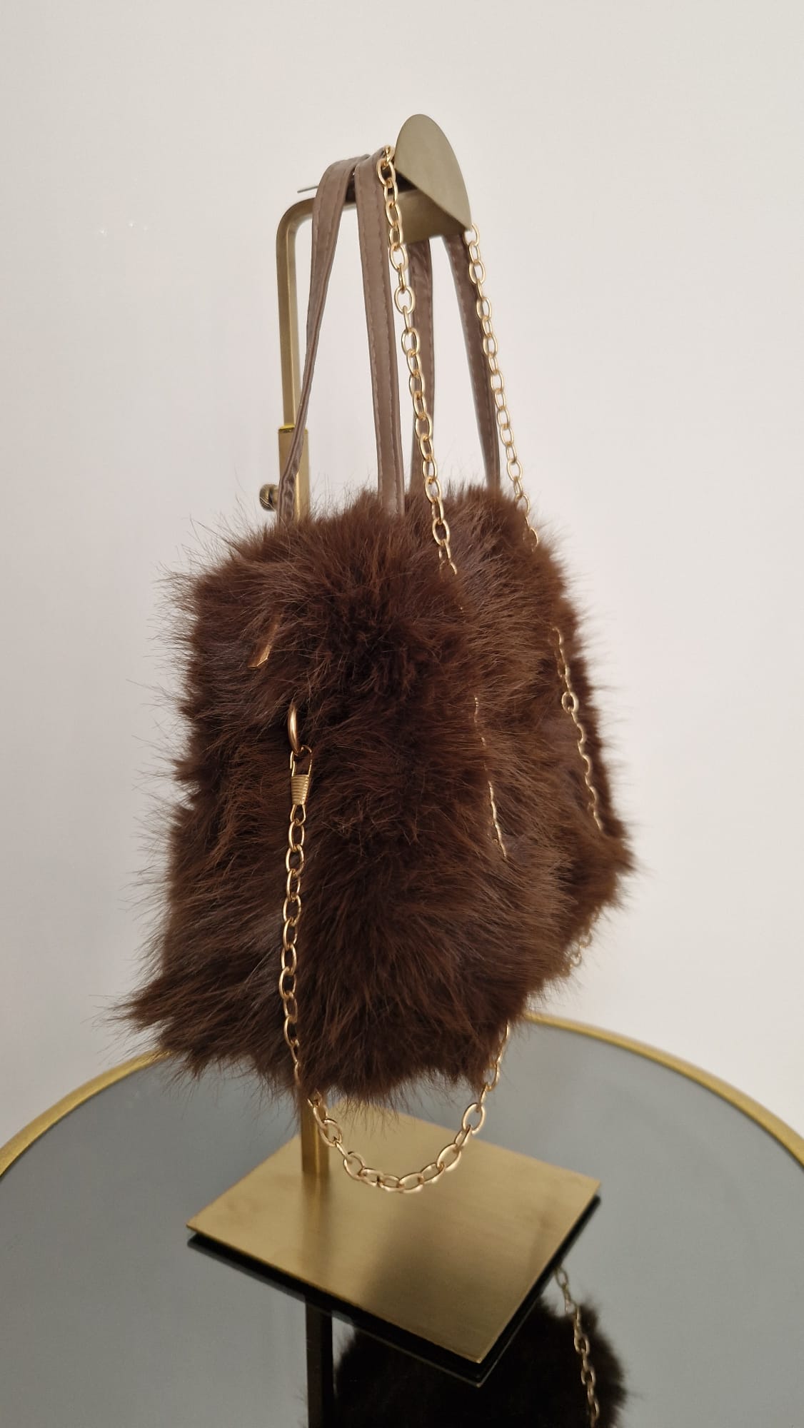 Borsetta Bon Bon in eco pelliccia colore marrone con catene in oro.