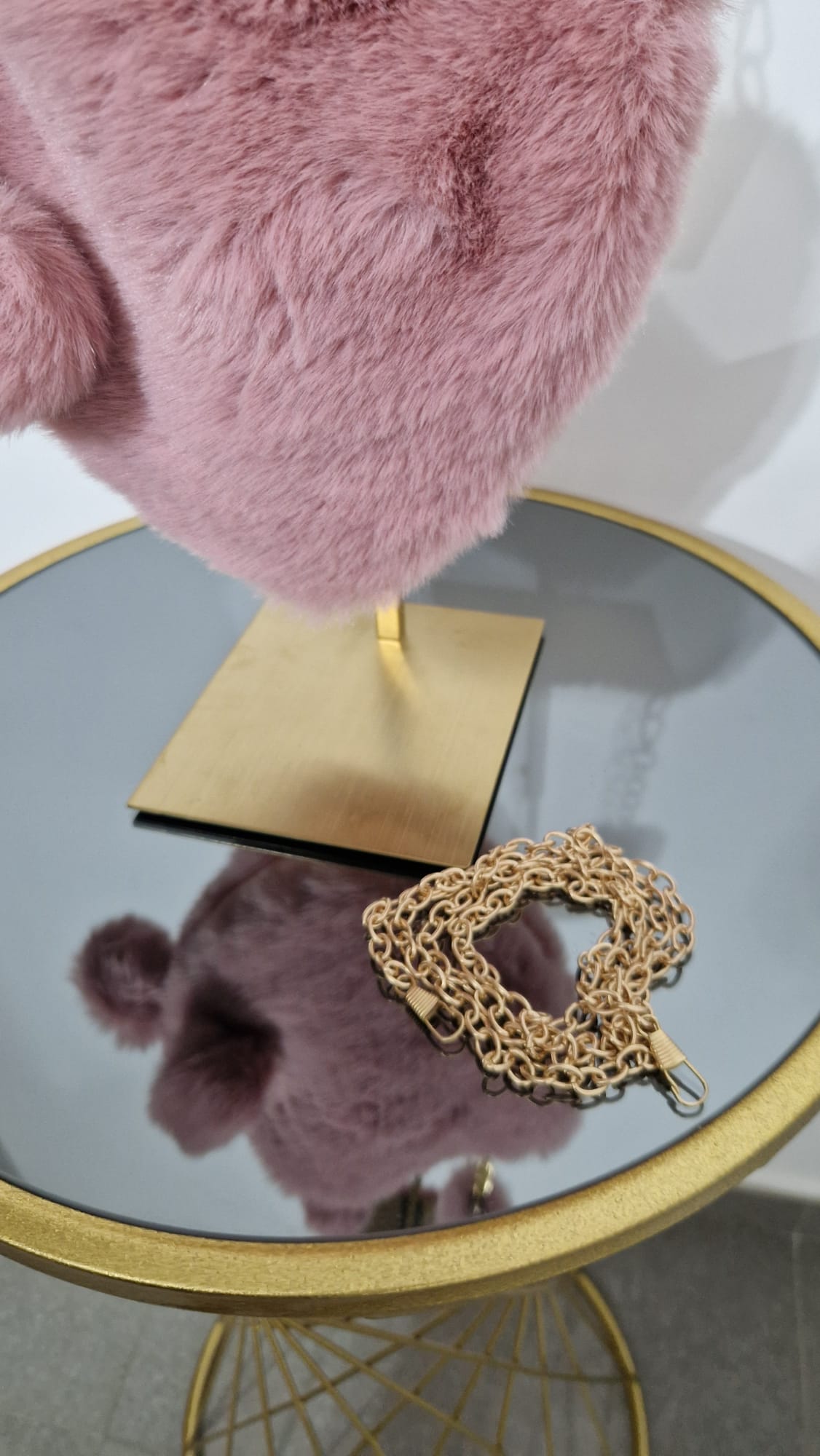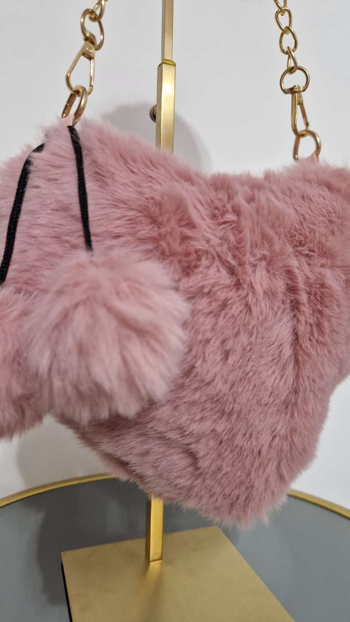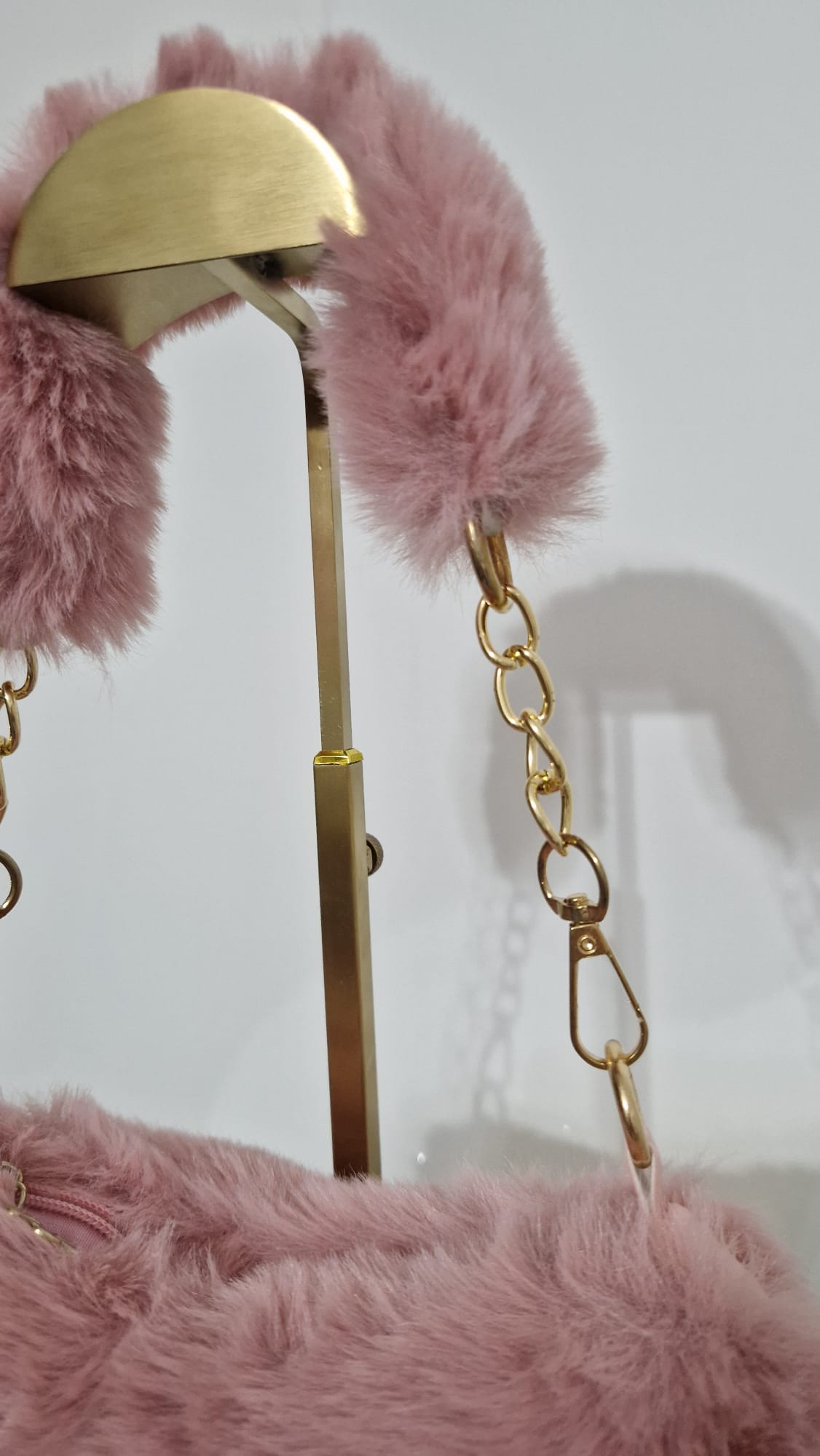 Borsetta Cuore colore rosa con pelliccia ecologica ,con manico a mano e completa di catena oro.