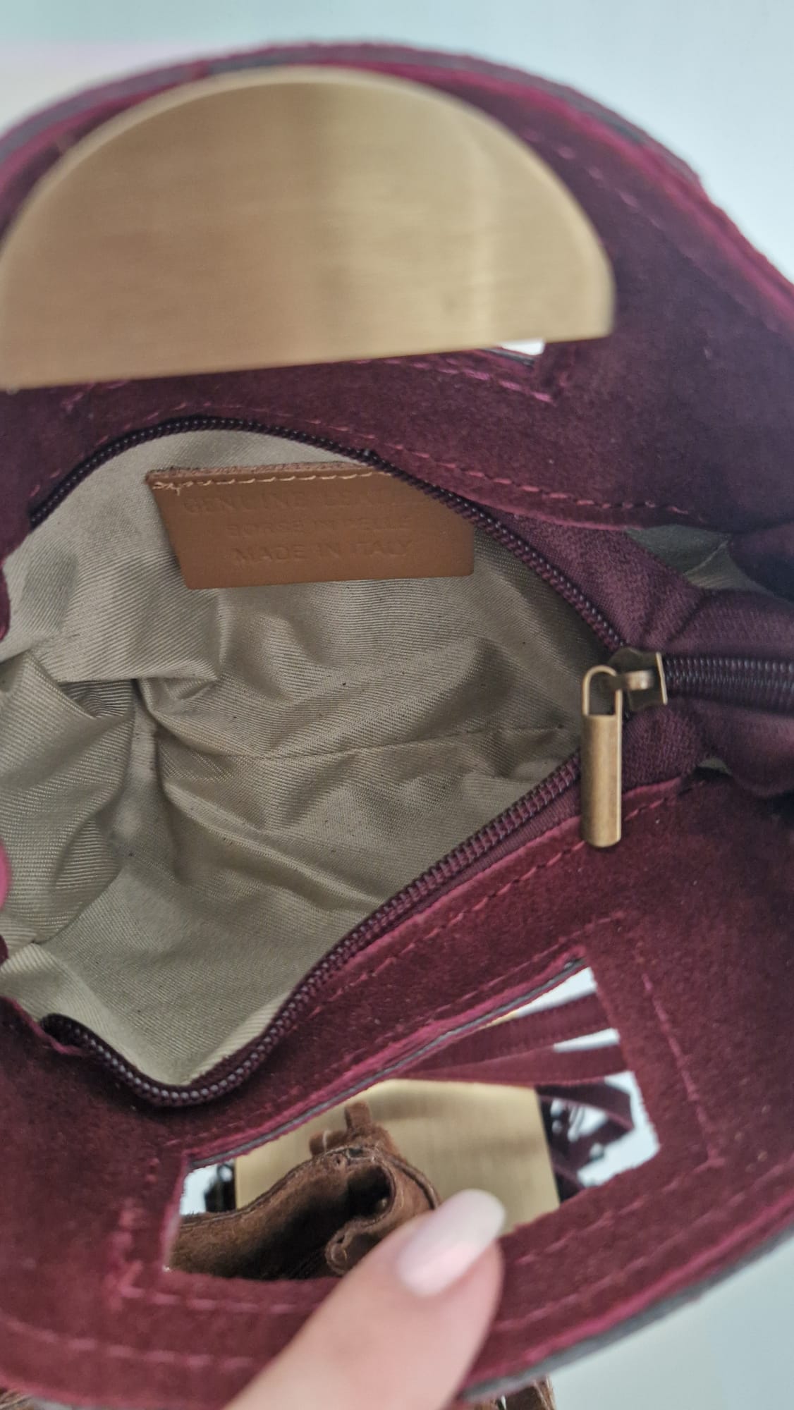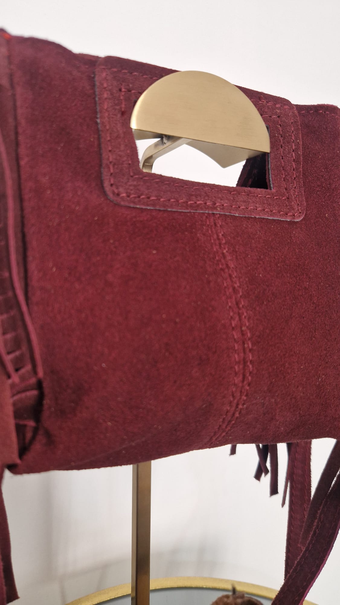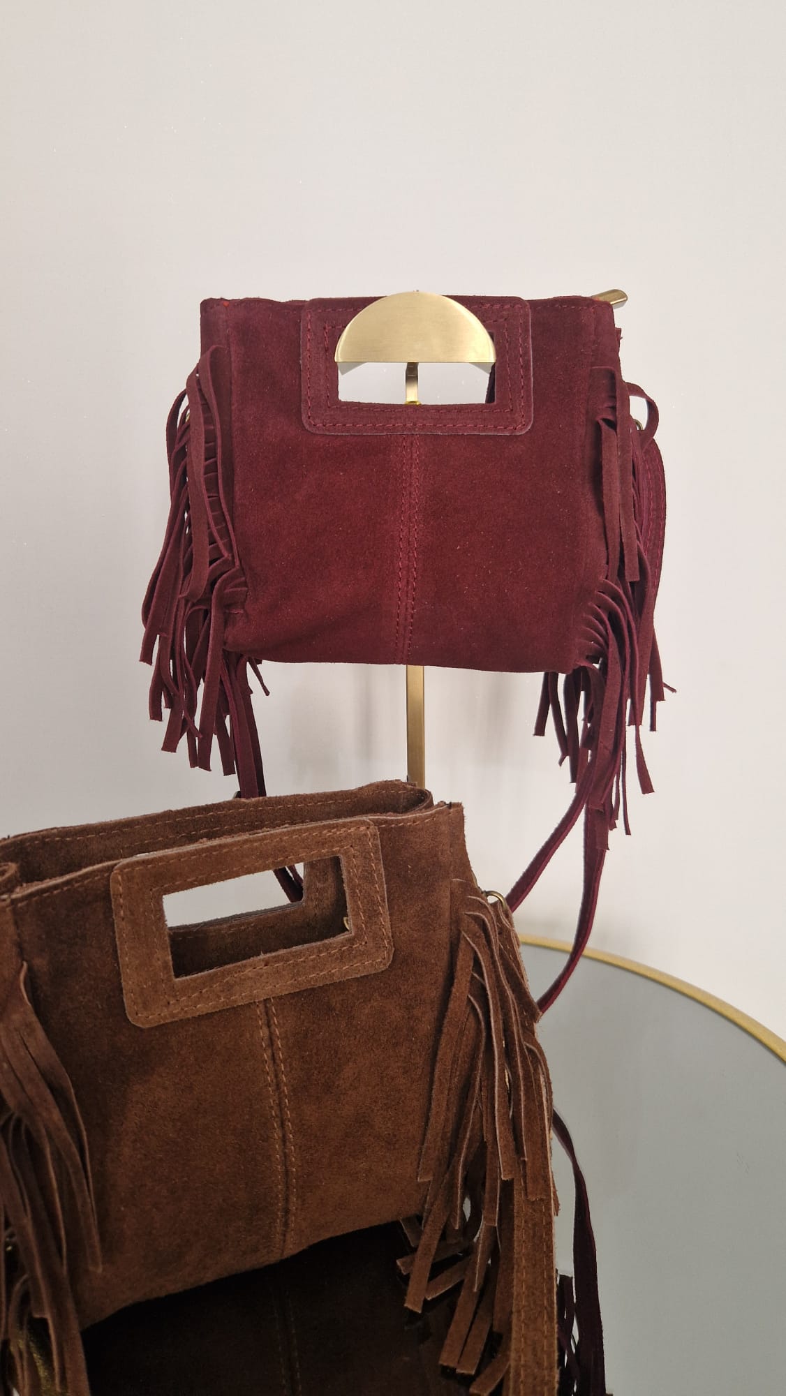 Borsetta in camoscio mini con frange colore bordeaux con tracolla regolabile .