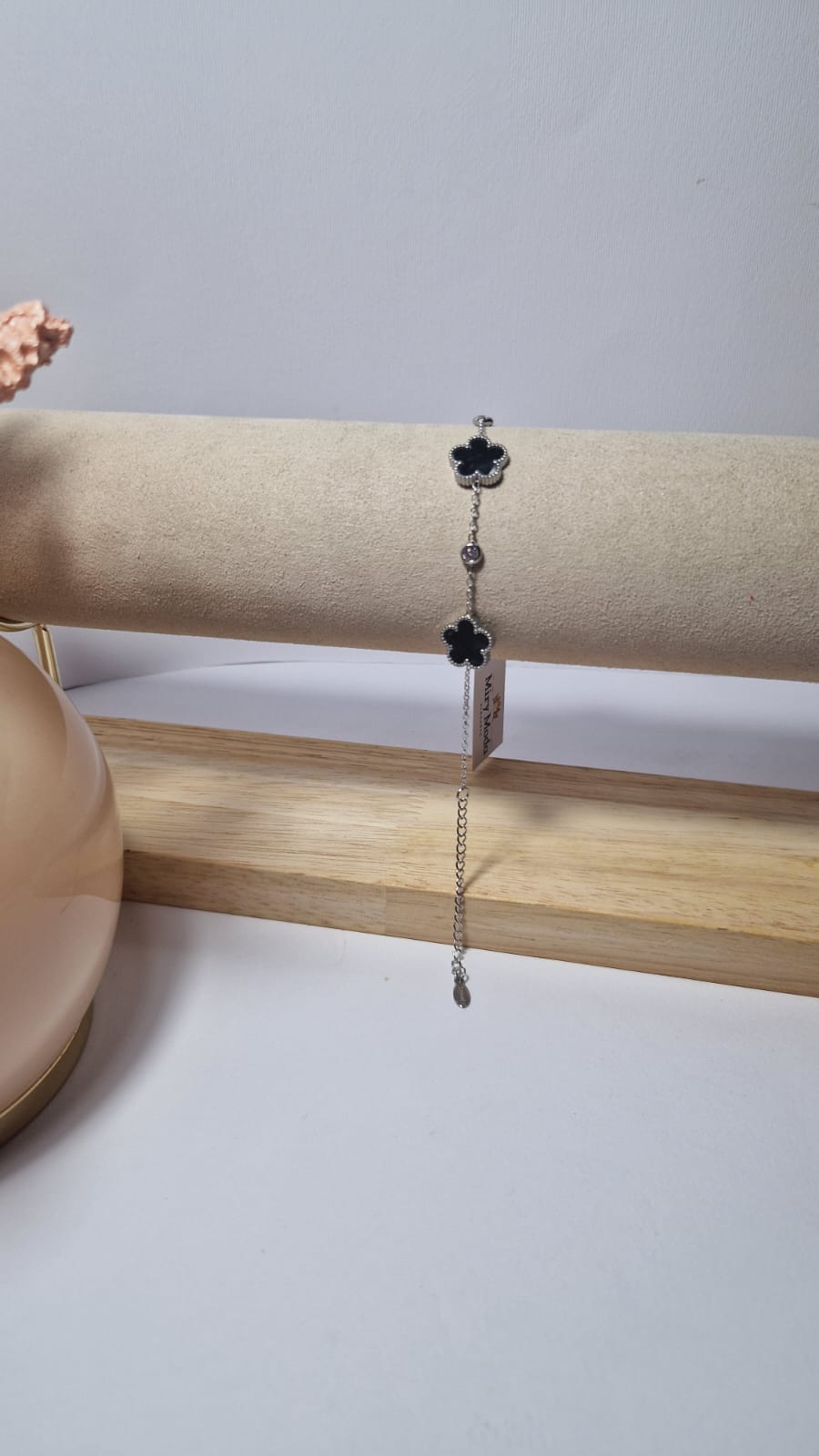 Bracciale Quadrifoglio madre perla colore nero con punto luce ,con montatura Silver.