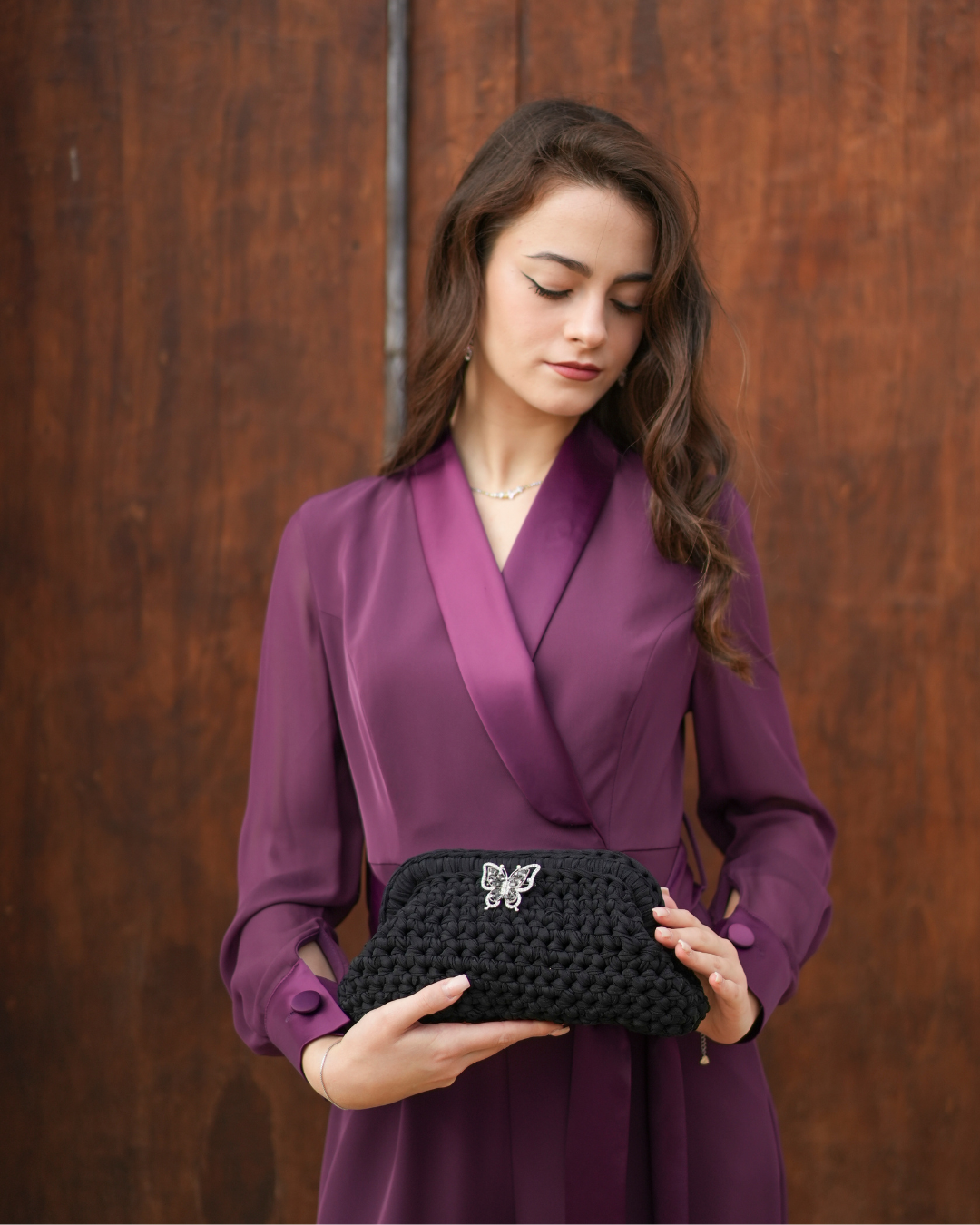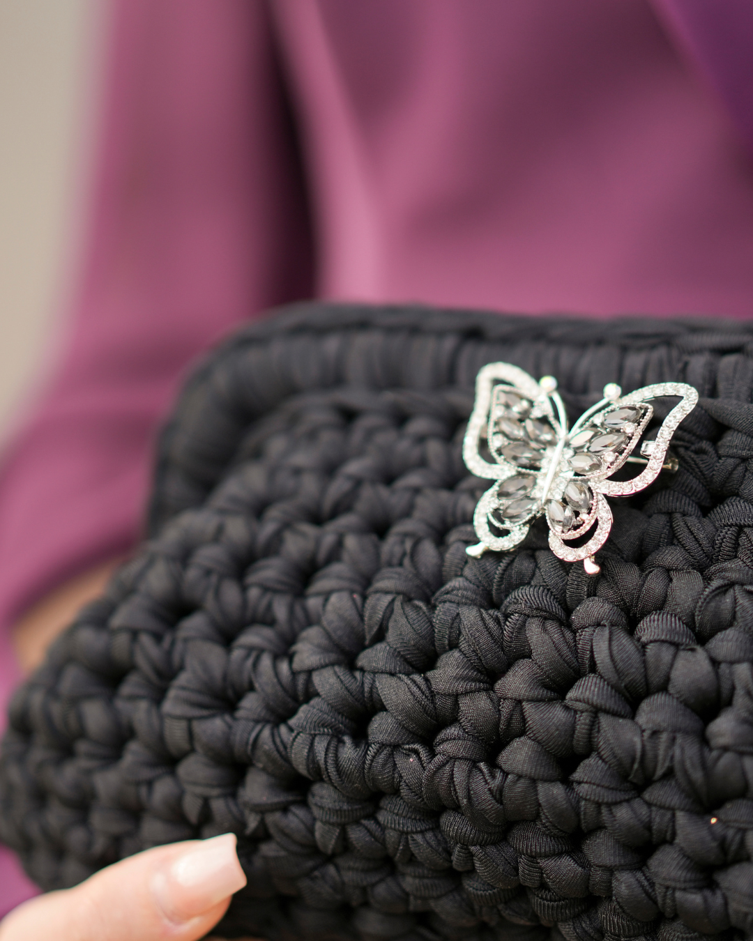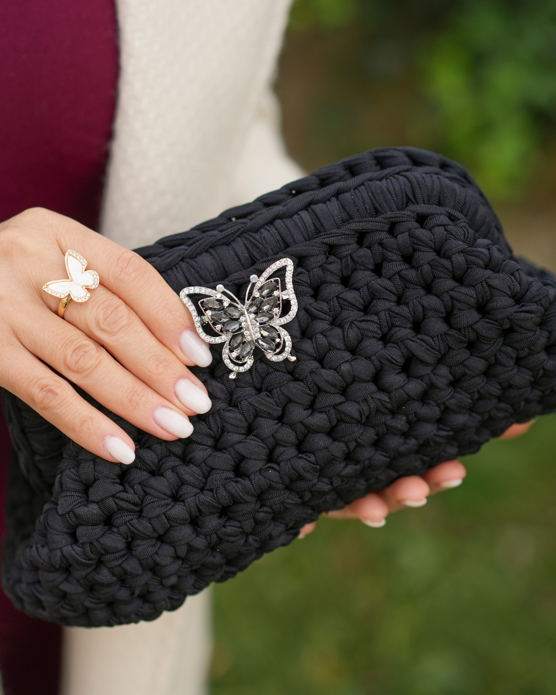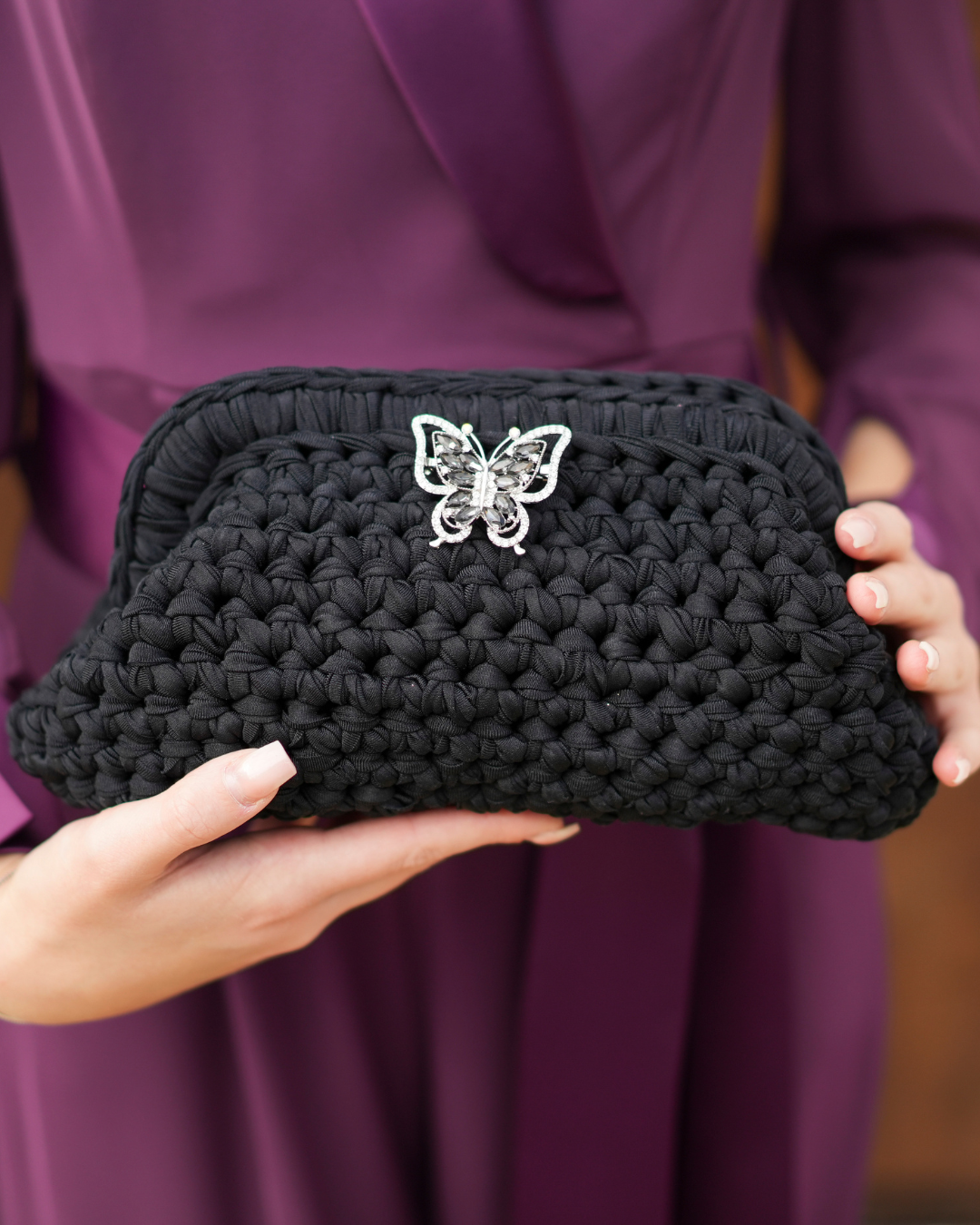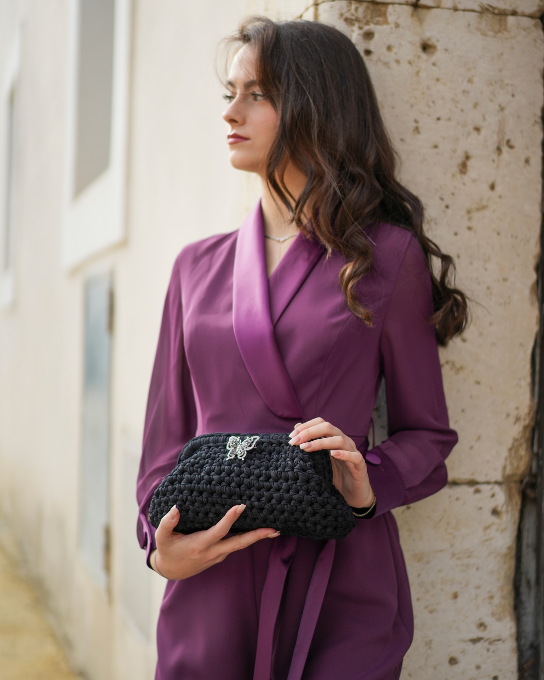 Eleganza senza tempo con chiusura automatica e spilla removibile in strass. La clutch Diana in lycra è disponibile nei colori nero, rosa antico e caramello. Dimensioni: 24x15x13 cm. Prezzo taglia M: 36€ (S: 29€, L: 41€).