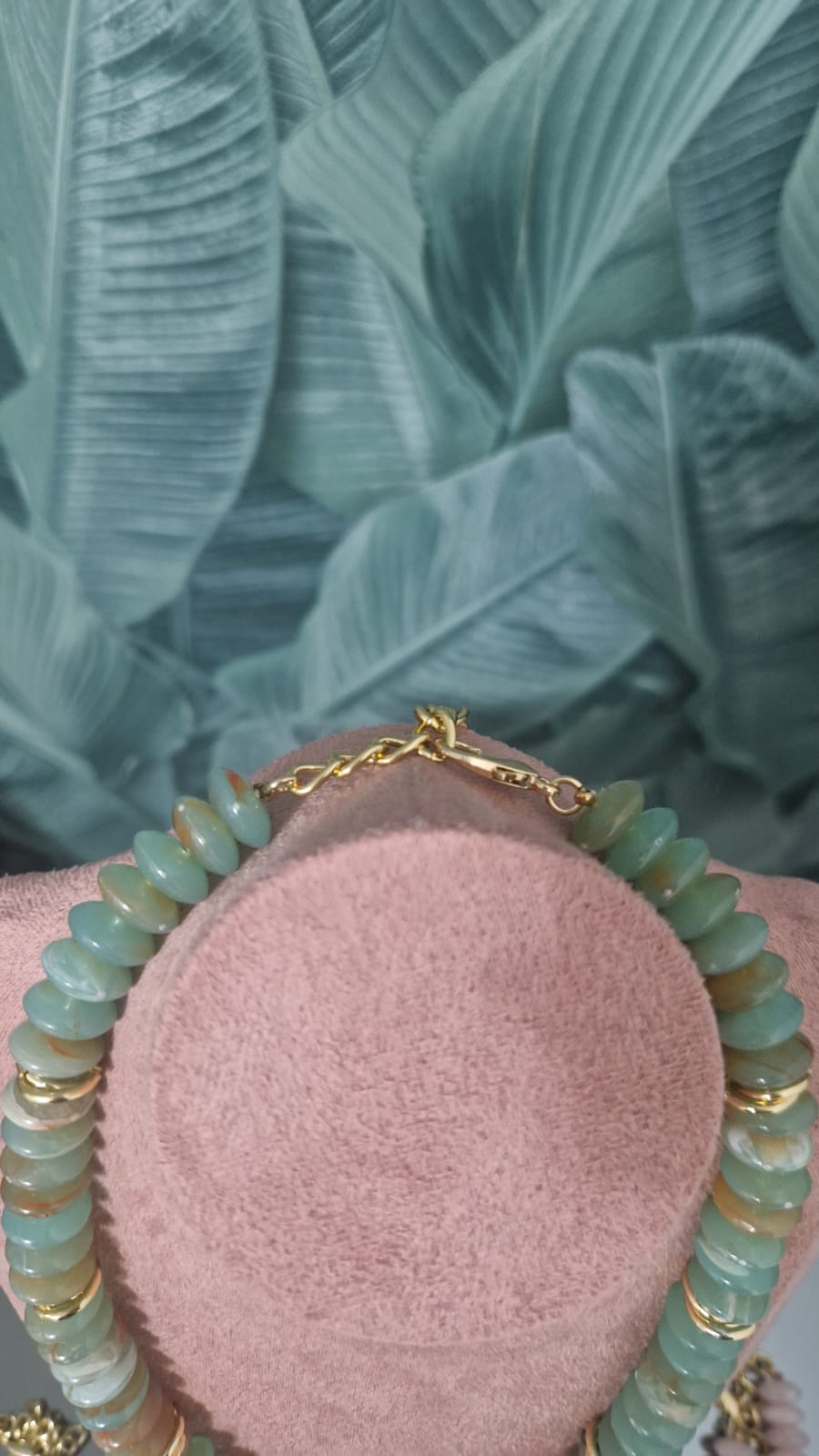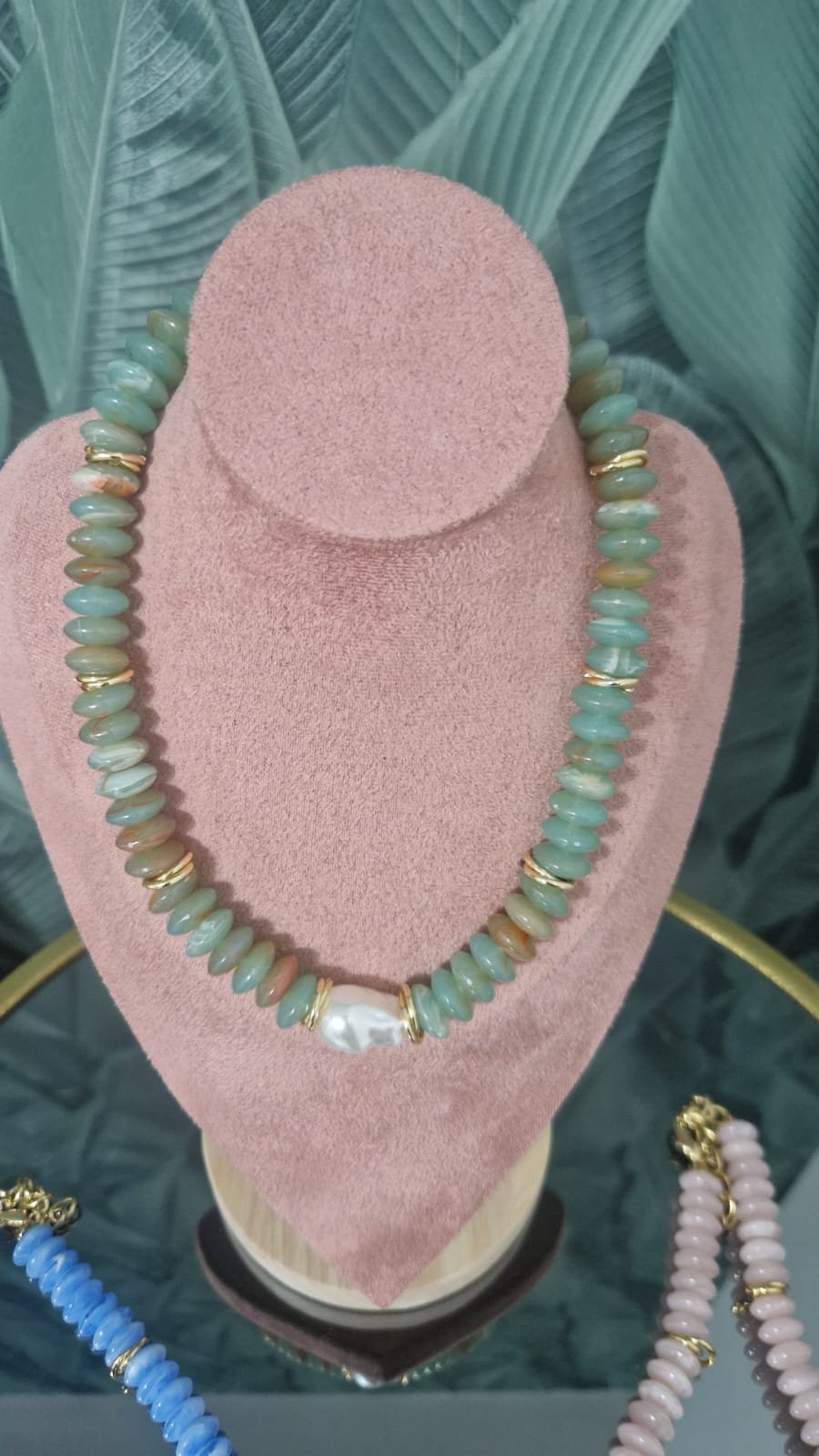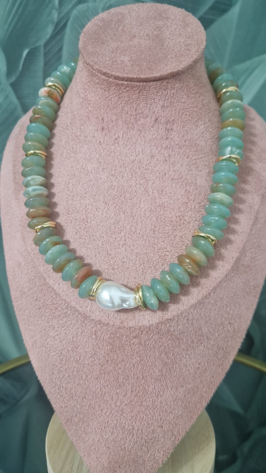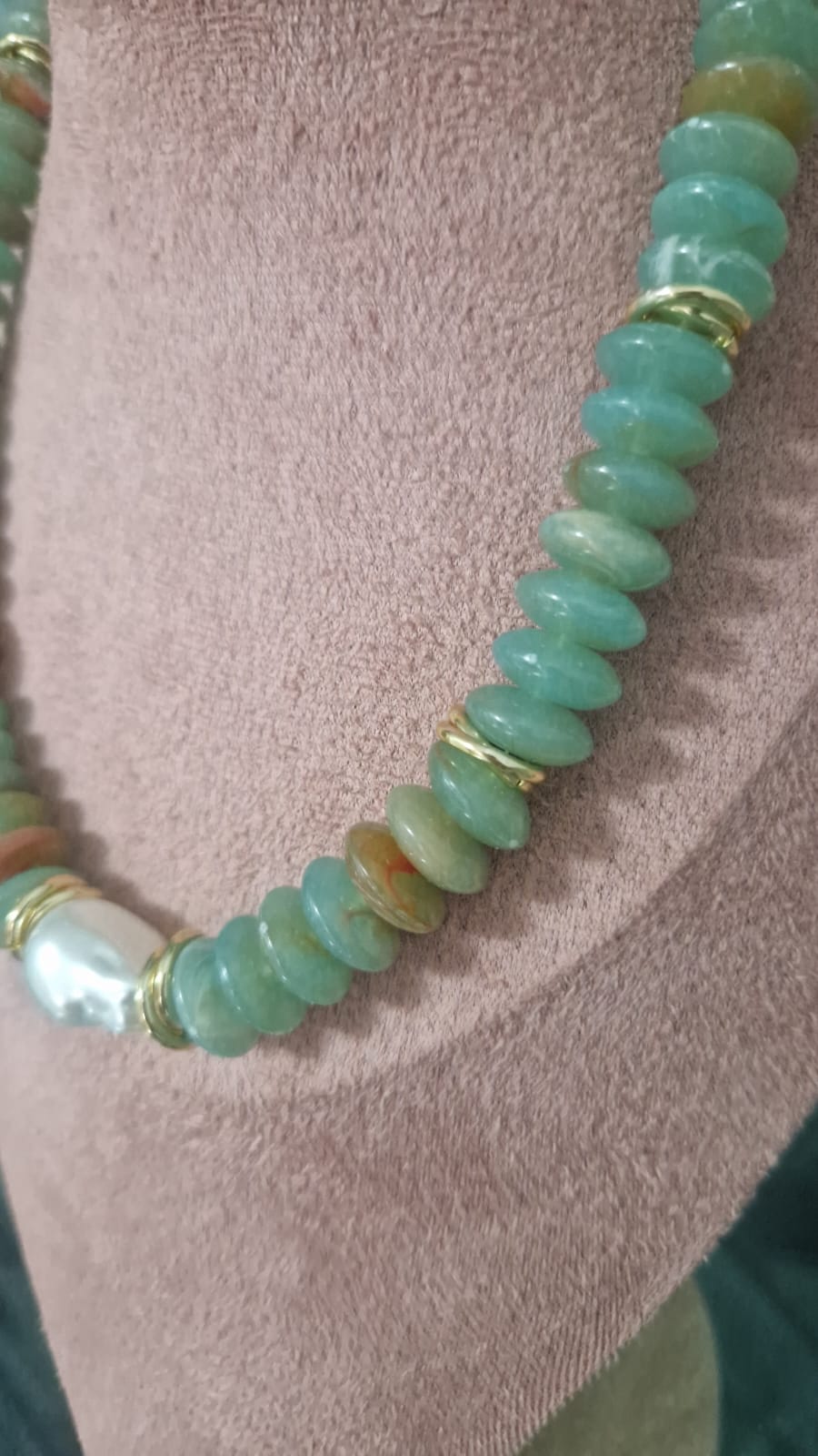 Girocollo in pietre colore verde con perla centrale .