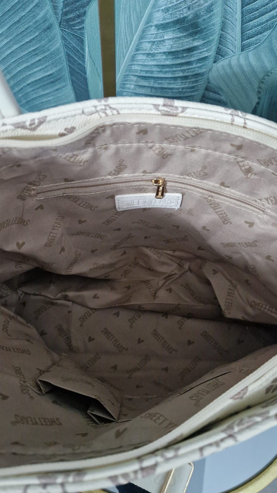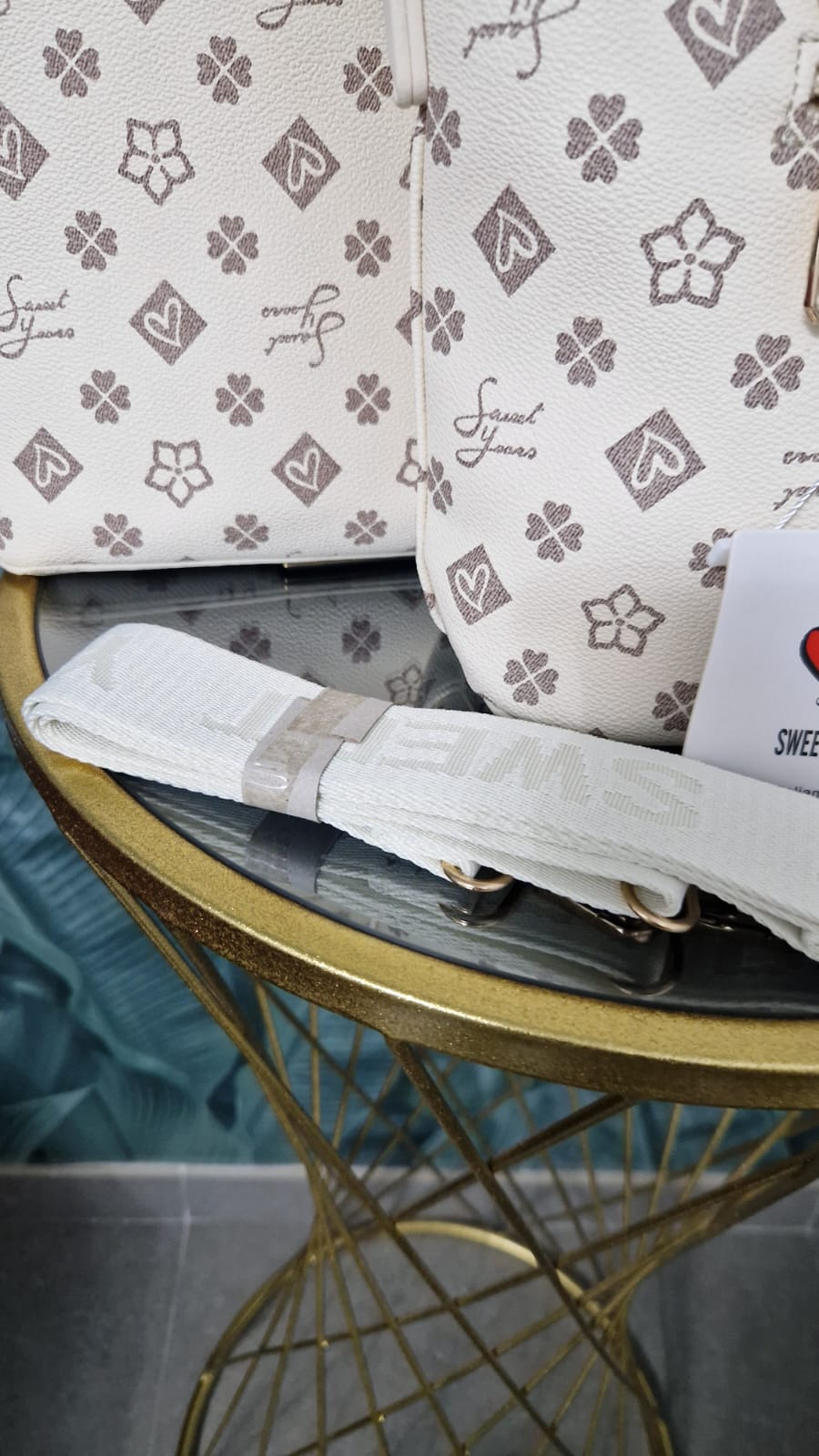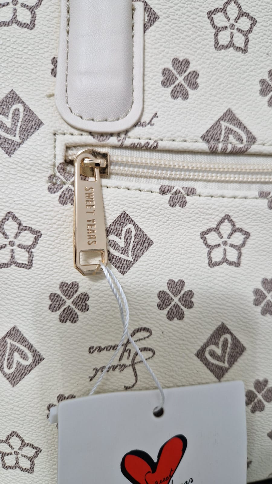 Set Borse Sweet Years colore panna con fantasia vintage ,modello manico lungo a spalla e complete di tracolla regolabile .